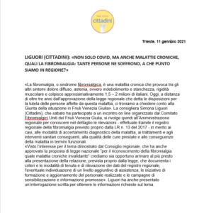 «La fibromialgia, o sindrome fibromialgica, è una malattia cronica che provoca tra gli altri sintomi dolore diffuso, astenia, ovvero indebolimento e stanchezza, rigidità muscolare e colpisce approssimativamente 1,5 – 2 milioni di italiani. Oggi, a distanza di oltre tre anni dall’approvazione della legge regionale che detta le disposizioni per la tutela delle persone affette da questa malattia, ci troviamo a chiedere conto alla Giunta della situazione in Friuli Venezia Giulia». La consigliera Simona Liguori (Cittadini), che sabato ha partecipato a un incontro on line organizzato dal Comitato Fibromialgici Uniti del Friuli Venezia Giulia, si rivolge quindi all’Amministrazione regionale per conoscere nel dettaglio le rilevazioni – effettuate tramite il registro regionale della fibromialgia previsto proprio dalla LR n. 13 del 2017 – in merito ai casi, alle modalità di accertamento diagnostico della malattia, ai trattamenti e agli interventi sanitari conseguenti, alla qualità delle cure prestate e alle conseguenze della malattia in termini funzionali.