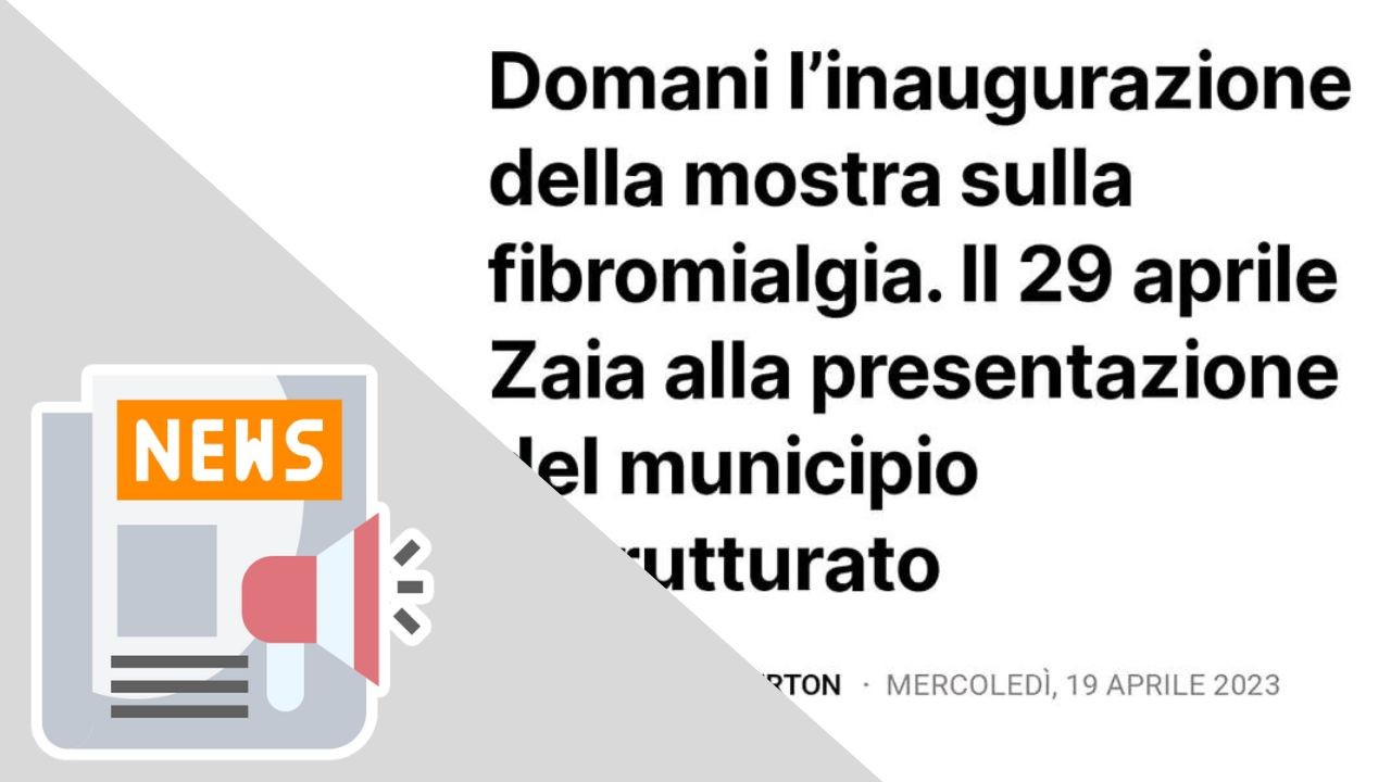 /in Eventi, Fibromialgia, News, Rassegna Stampa(QDPNEWS.IT) DOMANI L’INAUGURAZIONE DELLA MOSTRA SULLA FIBROMIALGIA. IL 29 APRILE ZAIA ALLA PRESENTAZIONE DEL MUNICIPIO RISTRUTTURATO