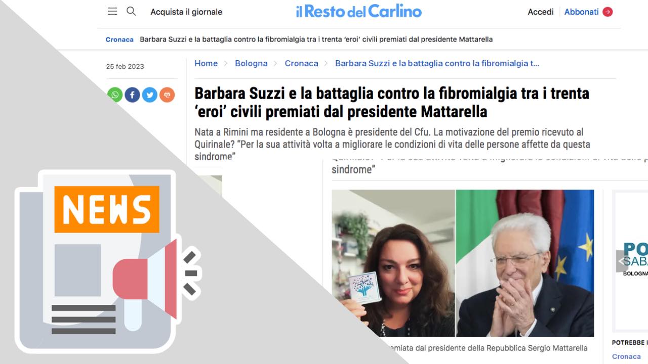 /in Fibromialgia, News, Rassegna Stampa(IL RESTO DEL CARLINO) BARBARA SUZZI E LA BATTAGLIA CONTRO LA FIBROMIALGIA TRA I TRENTA “EROI” CIVILI PREMIATI DAL PRESIDENTE MATTARELLA