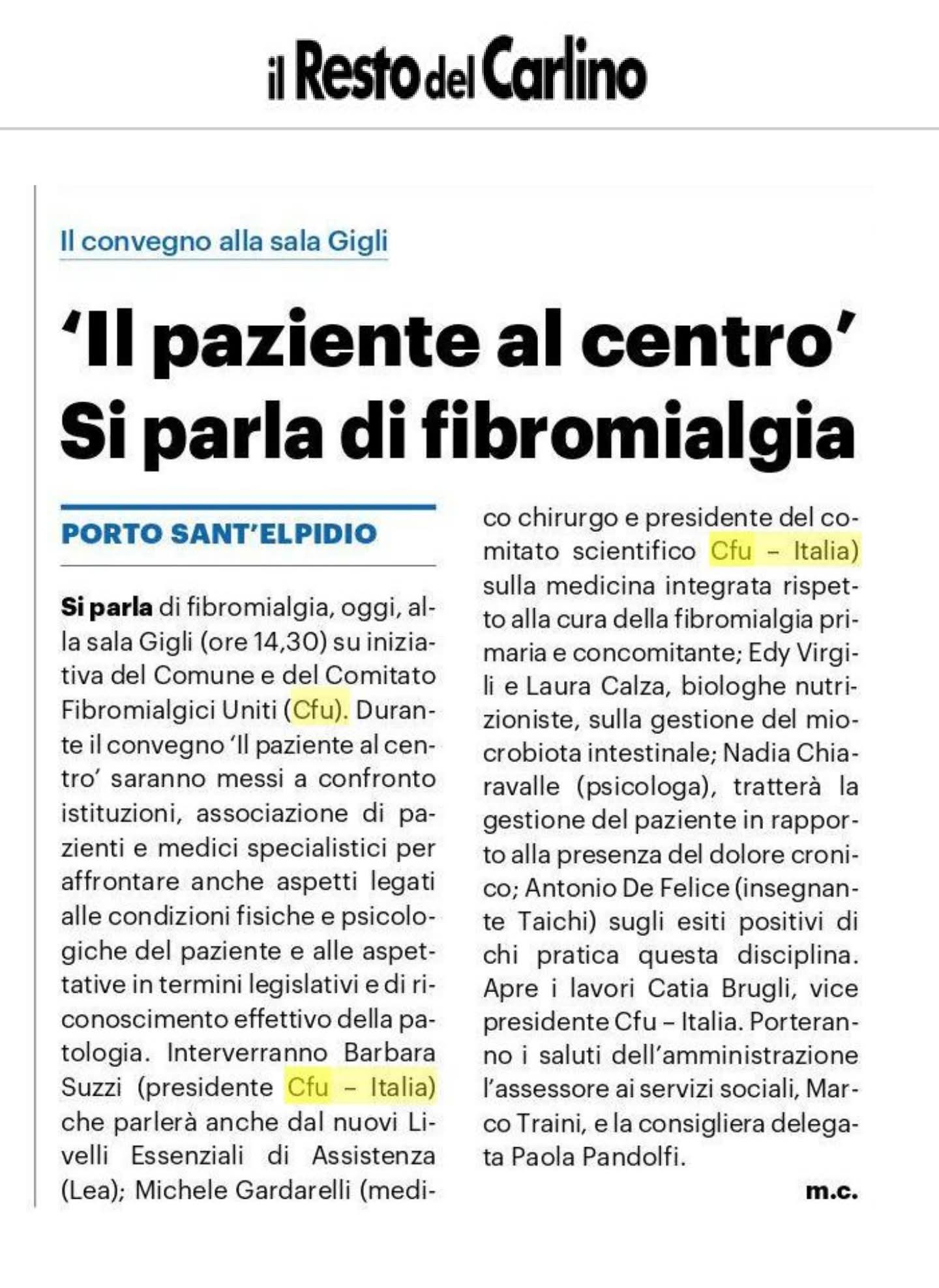 (IL RESTO DEL CARLINO) ‘IL PAZIENTE AL CENTRO’ SI PARLA DI FIBROMIALGIA