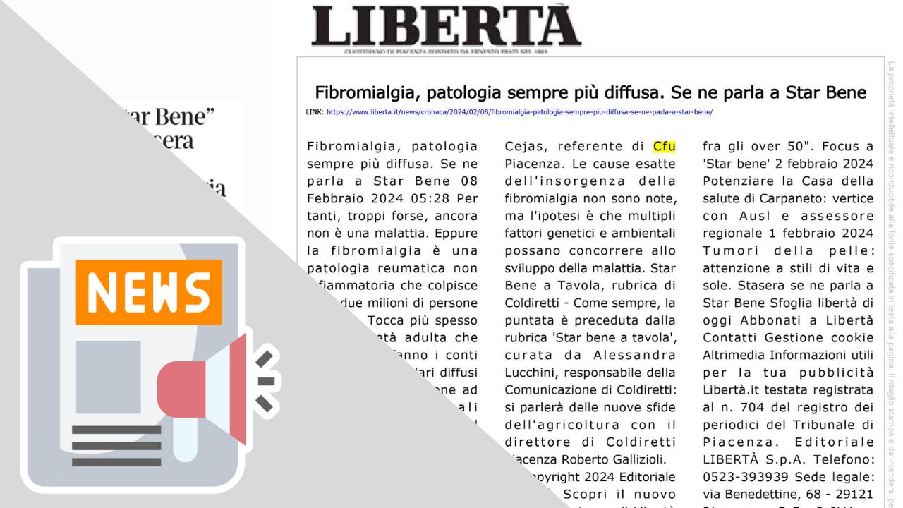 /in Fibromialgia, News, Rassegna StampaA “STAR BENE” SU TELELIBERTÀ SI PARLA DI FIBROMIALGIA: OSPITI BARBARA SUZZI, PRESIDENTE NAZIONALE CFU-ITALIA ODV E MARIA CARLA CEJAS, REFERENTE CFU-PIACENZA.