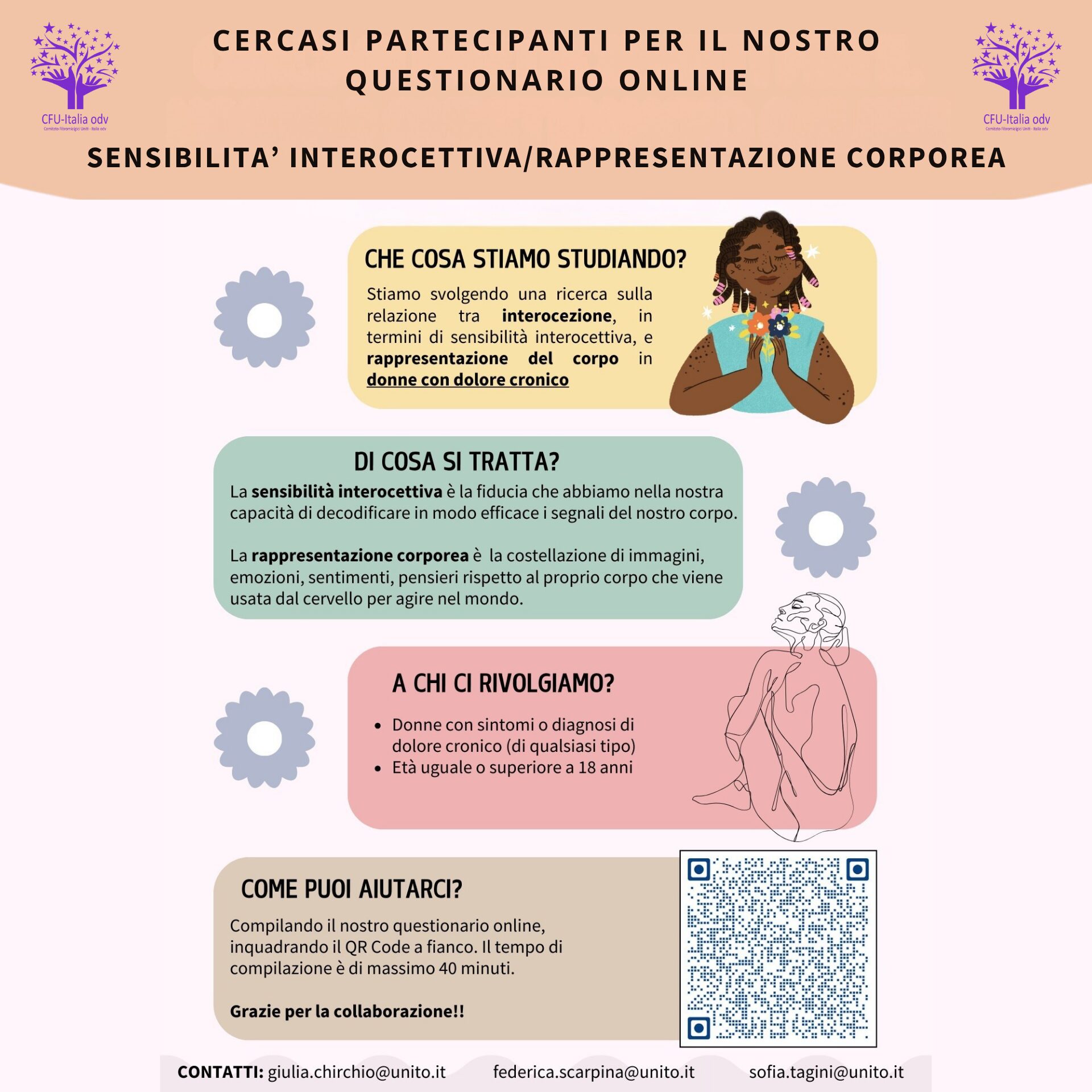 Stiamo svolgendo una ricerca sulla relazione tra interocezione, in termini di sensibilità interocettiva, e rappresentazione del corpo in donne con dolore cronico